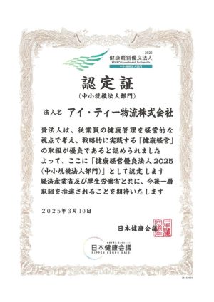 アイ・ティー物流株式会社は健康経営優良法人2025(中小規模法人部門)として 認定されております。